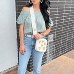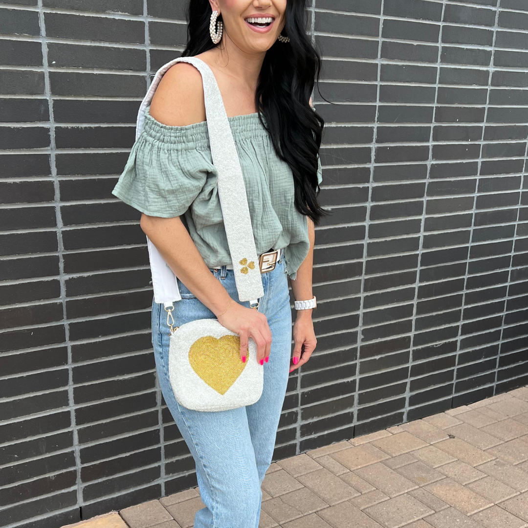 Wear your heart on your sleeve with the cutest square beaded bag. White beaded bag with six gold beaded hearts on one side and one big gold heart on the reverse side. Use it as an everyday bag or style it for a night out!