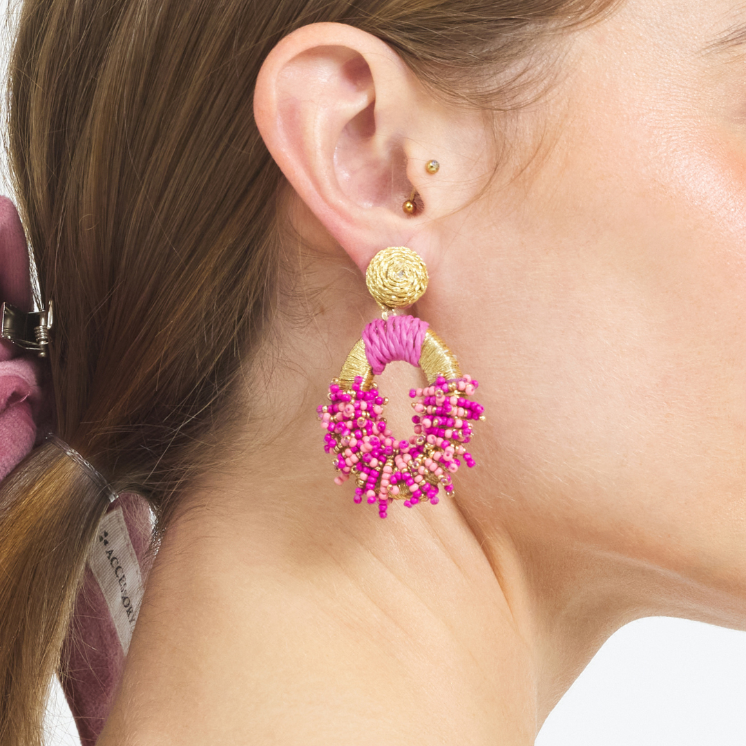 Add some playful flair to your summer look with 'Yours truly' earrings! These pink and gold seed bead earrings are lightweight and cute, perfect for any summer outfit. Embrace your fun side with this quirky accessory.