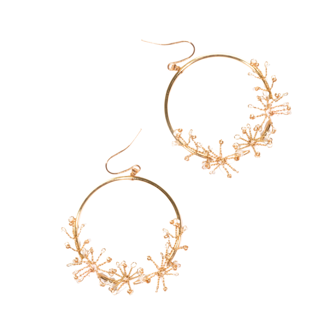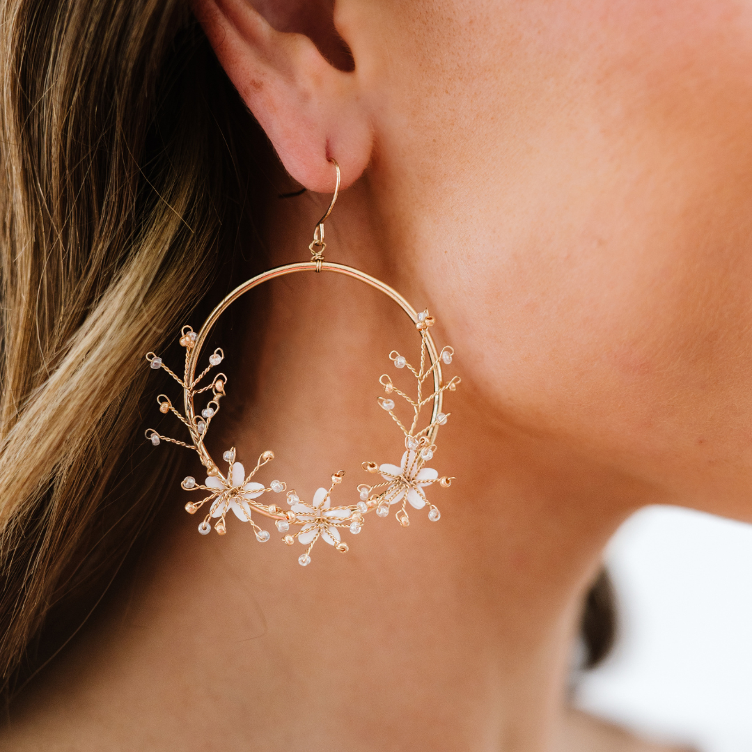 These Let Me Bloom earrings offer a sweet reminder of new growth, featuring golden wire encircling blooming flowers. Crafted with exquisite detail, these earrings are a meaningful symbol of growth, hope, and renewal.