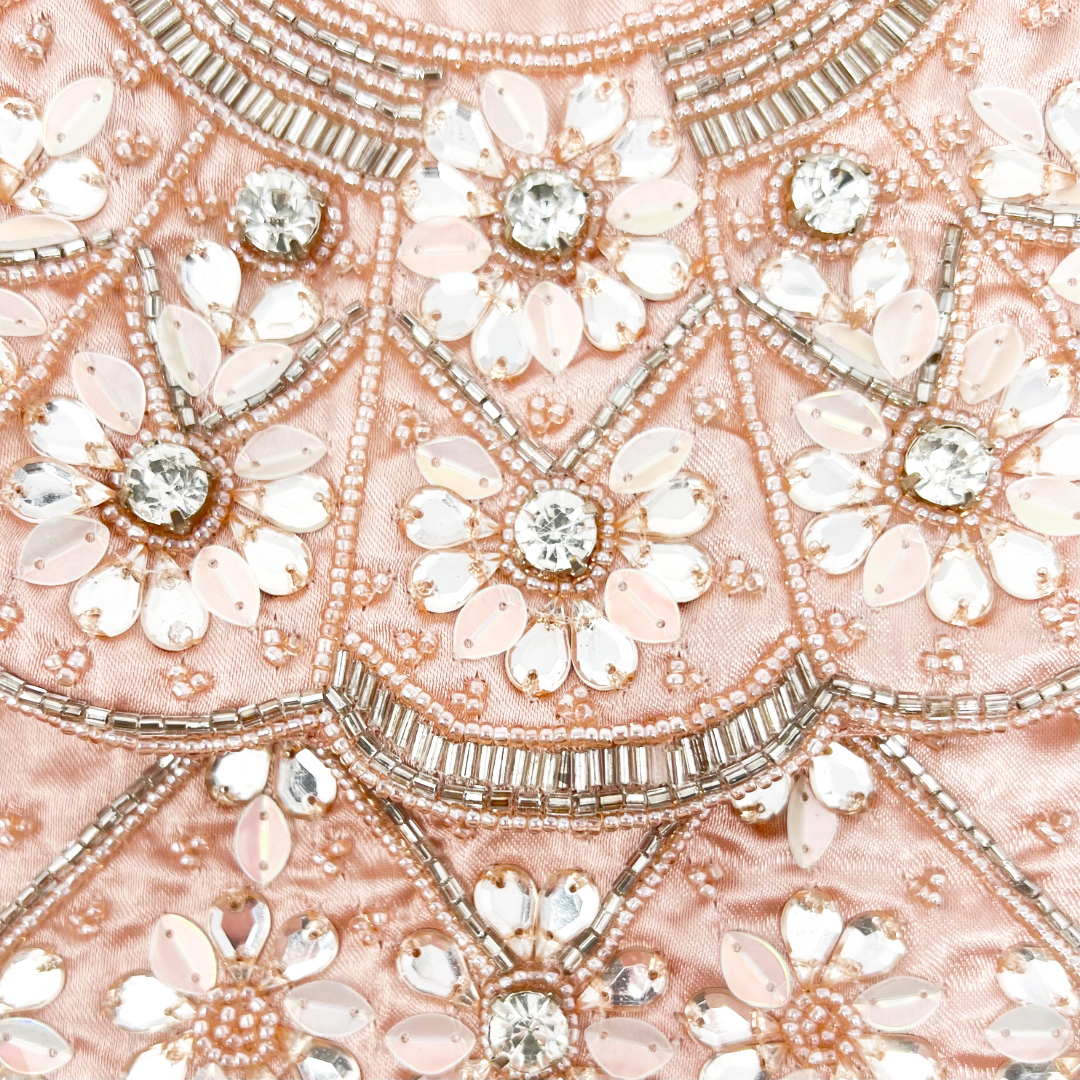 • Pink satin with gemstone and beaded embellishment